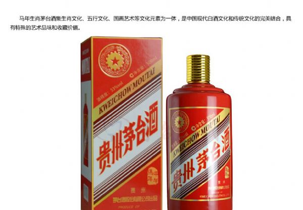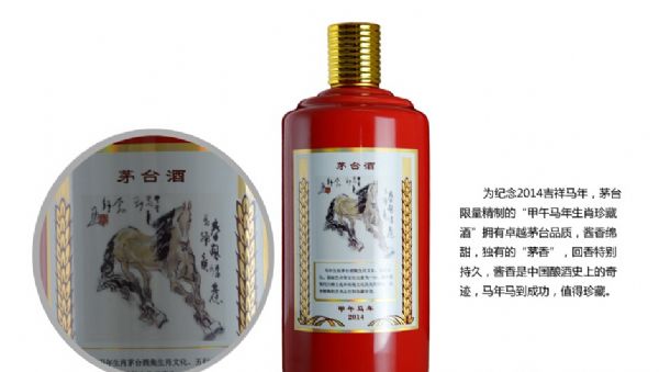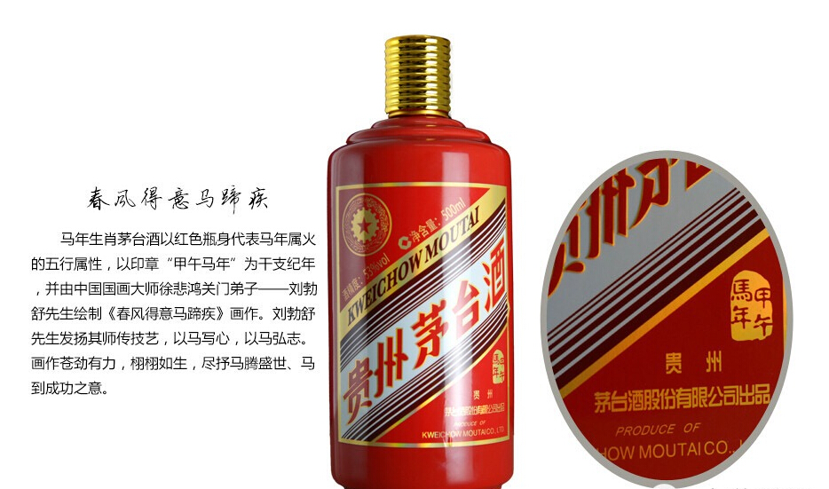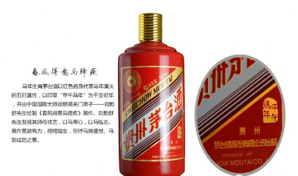 | 馬年生肖茅臺(tái)酒以紅色瓶身代表馬年屬火的五行屬性,以印章“甲午馬年”為干支紀(jì)年,并由中國(guó)國(guó)畫(huà)大師徐悲鴻關(guān)門(mén)弟子--劉勃舒先生繪制《春風(fēng)得意馬蹄疾》畫(huà)作。劉勃舒先生發(fā)揚(yáng)其師傳技藝,以馬寫(xiě)心,以馬弘志。畫(huà)作蒼勁有力,栩栩如生,盡抒馬騰盛世、馬到成功之意。 市場(chǎng)價(jià):1199元/瓶 |
