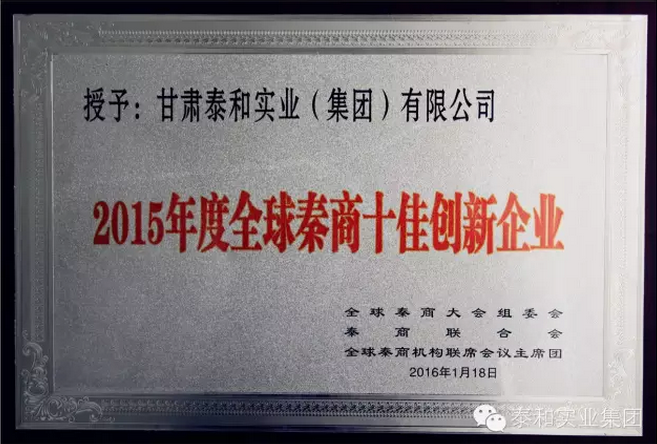 甘肅泰和實(shí)業(yè)(集團(tuán))有限公司摘得"2015年度全球秦商十佳創(chuàng)新企業(yè)",此獎(jiǎng)表彰企業(yè)自主創(chuàng)新、產(chǎn)業(yè)轉(zhuǎn)型和管理創(chuàng)新方面的突出成就!