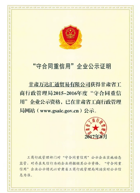 日前,甘肅省工商行政管理局對2015年—2016年度“守合同重信用企業(yè)”進(jìn)行了公示。甘肅泰和實業(yè)(集團)有限公司旗下甘肅萬達(dá)匯通貿(mào)易有限公司(以下簡稱“萬達(dá)匯通”)憑借良好的企業(yè)信譽,獲得了2015年—2016年度甘肅省“守合同重信用”企業(yè)榮譽稱號。