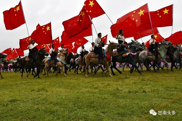 上午10時許,隨著高云龍宣布第二十屆九色甘南香巴拉旅游藝術(shù)節(jié)開幕,由千匹駿馬、千名騎手組成的馬隊如騰飛的巨龍一般從主席臺前飛馳而過,象征著偉大祖國從站起來、富起來到強(qiáng)起來光輝歷程的71面五星紅旗在會場迎風(fēng)飄揚(yáng)……